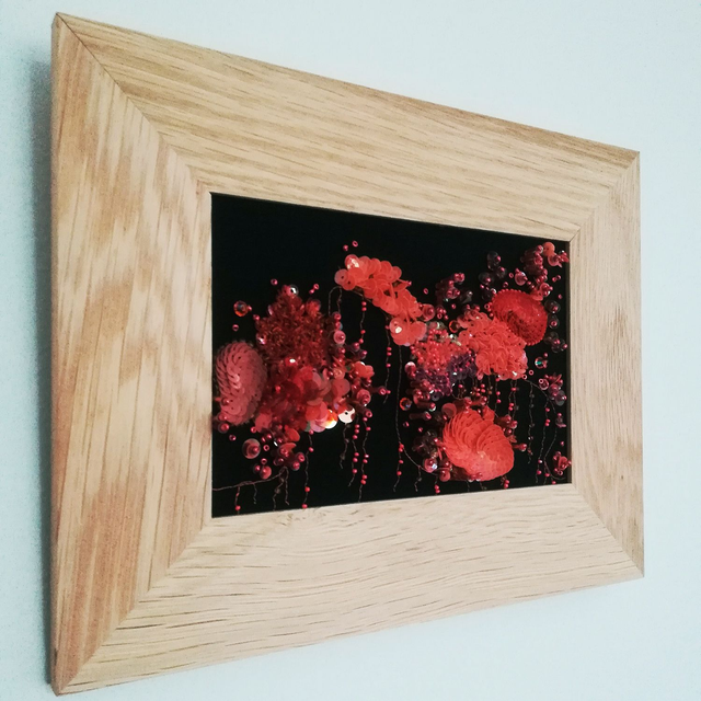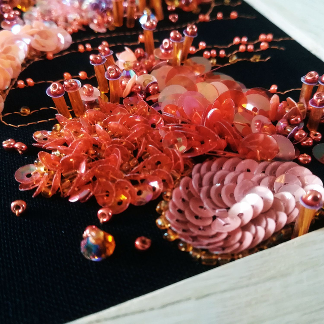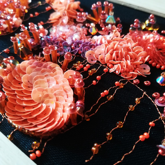 Saisissez toute la beauté de ces oeuvres à travers les reliefs, les couleurs intenses et les reflets lumineux. Les perles et les paillettes de Lunéville sont soigneusement brodées sur une cotonnade puis appliquées sur le support du cadre.