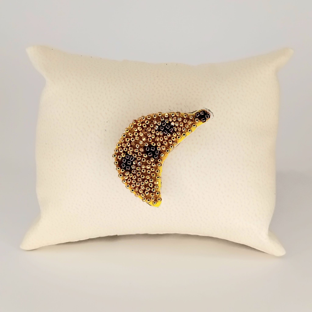 Les perles et les paillettes de Lunéville sont soigneusement brodées sur une cotonnade, appliquées sur une feutrine puis sur le support en en cuir beige. Les reflets lumineux varient avec les mouvements pour plus de brillance !