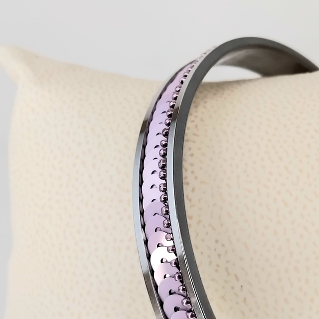Les perles et les paillettes de Lunéville sont soigneusement brodées sur une cotonnade puis appliquées sur le support en Acier inoxydable. Les reflets lumineux varient avec le mouvement du poignet pour plus de brillance !