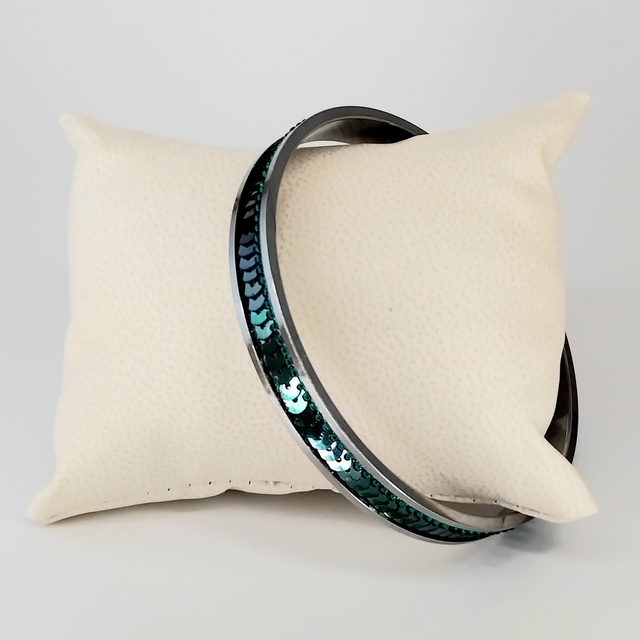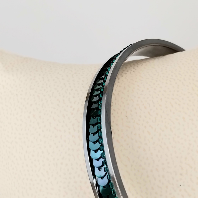 Les perles et les paillettes de Lunéville sont soigneusement brodées sur une cotonnade puis appliquées sur le support en Acier inoxydable. Les reflets lumineux varient avec le mouvement du poignet pour plus de brillance !