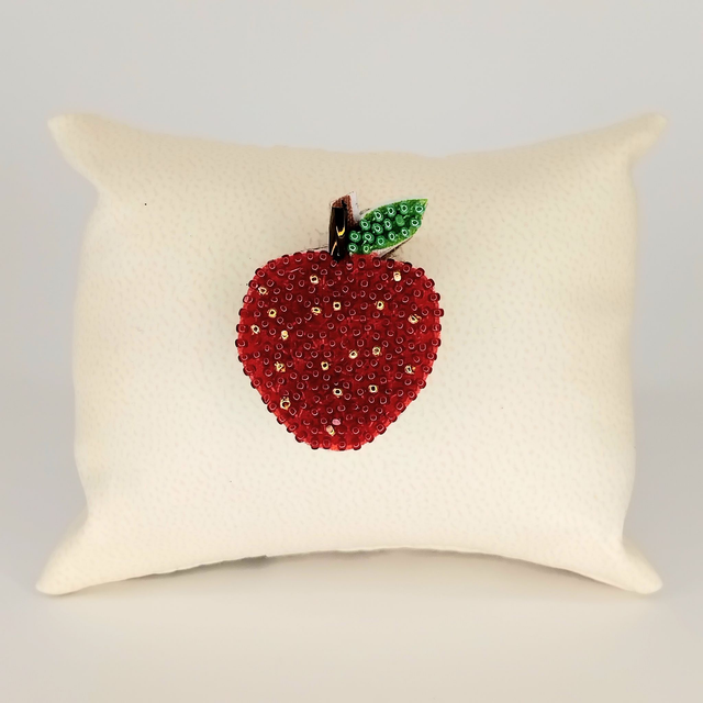 Les perles et les paillettes de Lunéville sont soigneusement brodées sur une cotonnade, appliquées sur une feutrine puis sur le support en en cuir beige. Les reflets lumineux varient avec les mouvements pour plus de brillance !