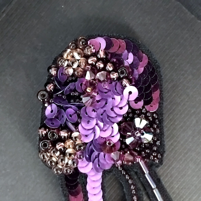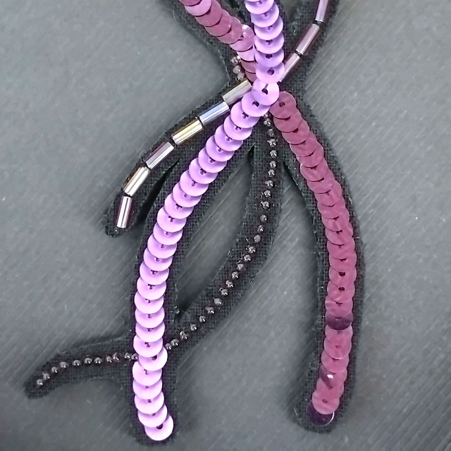 Les perles et les paillettes de Lunéville sont soigneusement brodées sur une cotonnade, appliquées sur une feutrine puis sur le support en en cuir noir. Les reflets lumineux varient avec les mouvements pour plus de brillance !