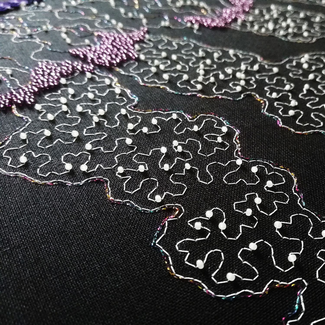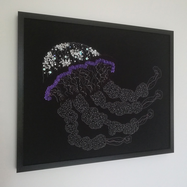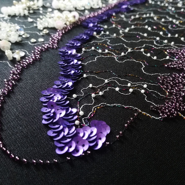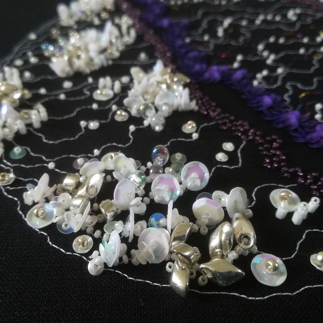 Saisissez toute la beauté de ces oeuvres à travers les reliefs, les couleurs intenses et les reflets lumineux. Les perles et les paillettes de Lunéville sont soigneusement brodées sur une cotonnade puis appliquées sur le support du cadre.