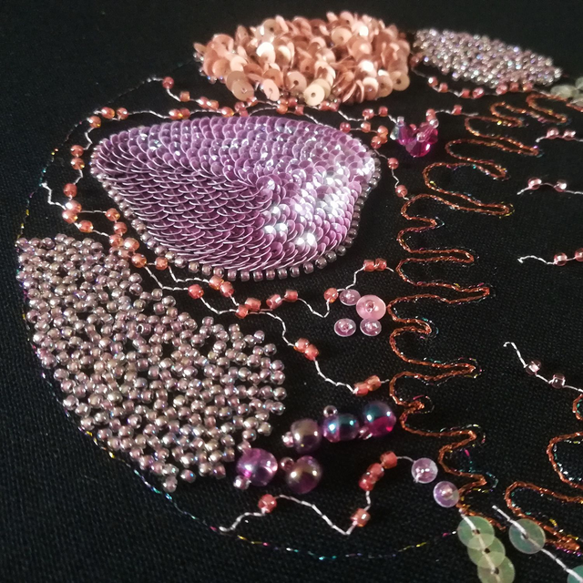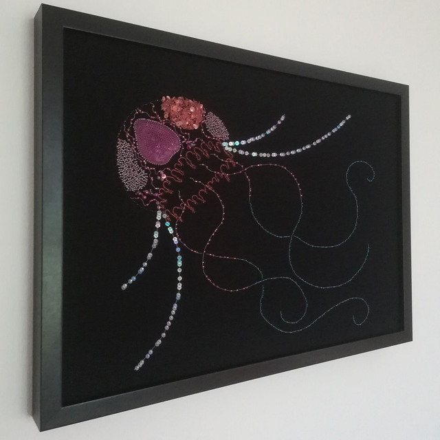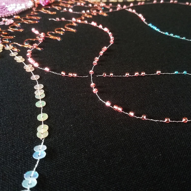 Saisissez toute la beauté de ces oeuvres à travers les reliefs, les couleurs intenses et les reflets lumineux. Les perles et les paillettes de Lunéville sont soigneusement brodées sur une cotonnade puis appliquées sur le support du cadre.