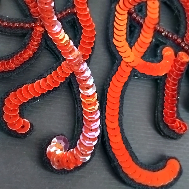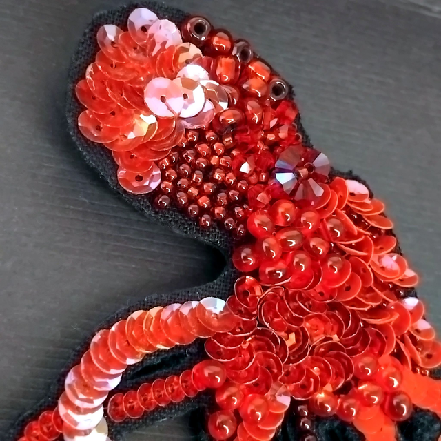 Les perles et les paillettes de Lunéville sont soigneusement brodées sur une cotonnade, appliquées sur une feutrine puis sur le support en en cuir noir. Les reflets lumineux varient avec les mouvements pour plus de brillance !