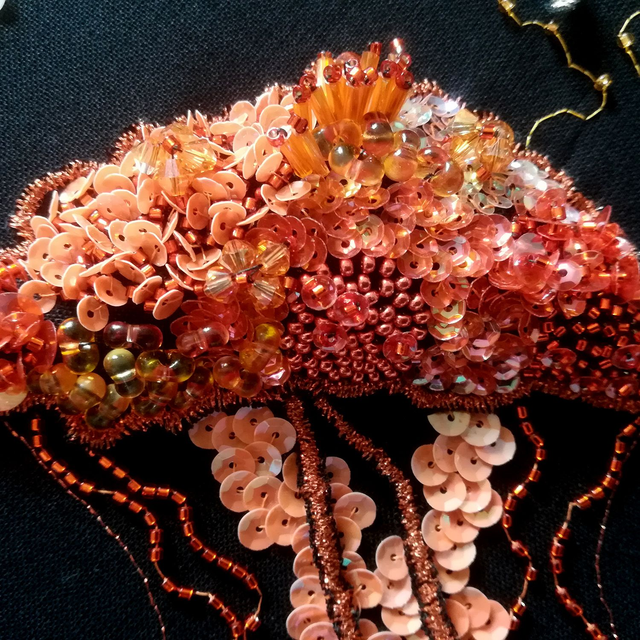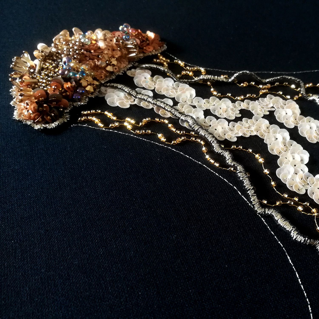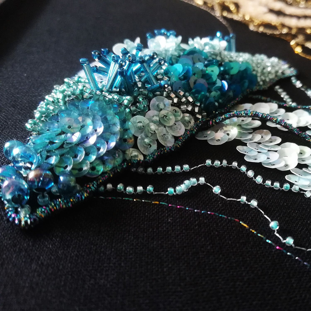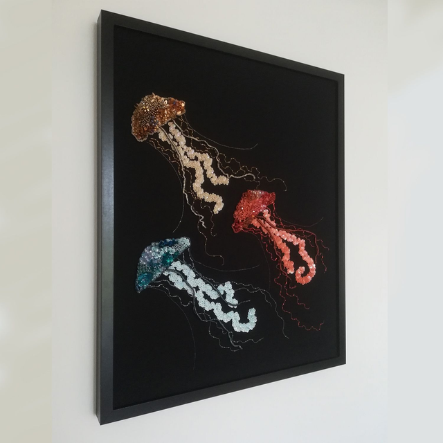 Saisissez toute la beauté de ces oeuvres à travers les reliefs, les couleurs intenses et les reflets lumineux. Les perles et les paillettes de Lunéville sont soigneusement brodées sur une cotonnade puis appliquées sur le support du cadre.